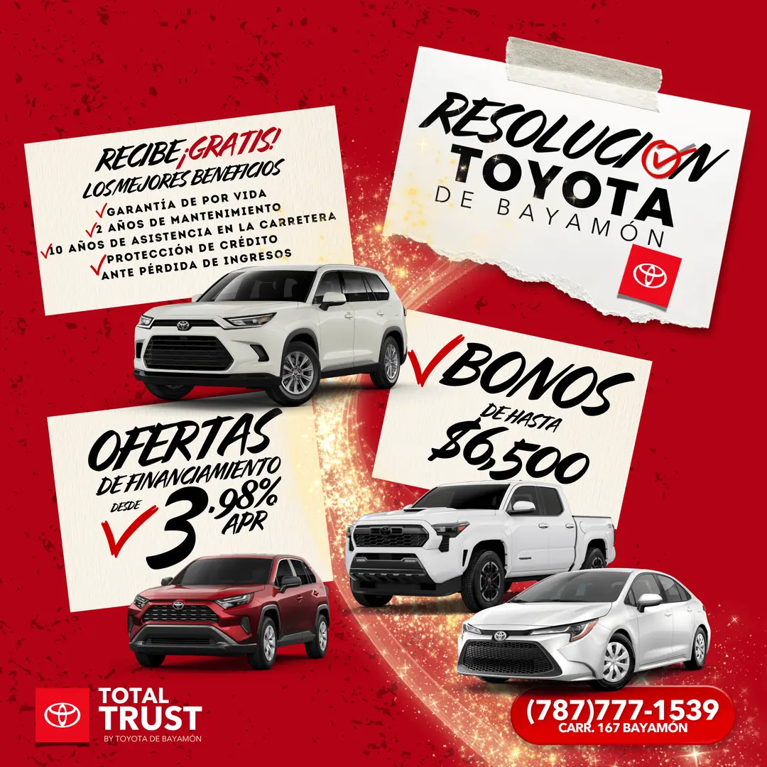 Aprovecha las ofertas Toyota Puerto Rico disponibles por tiempo limitado. Ofrecemos bonos al momento, financiamiento especial y descuentos en vehículos nuevos y usados. No pierdas la oportunidad de llevarte tu Toyota favorito con una mensualidad que puedas manejar.